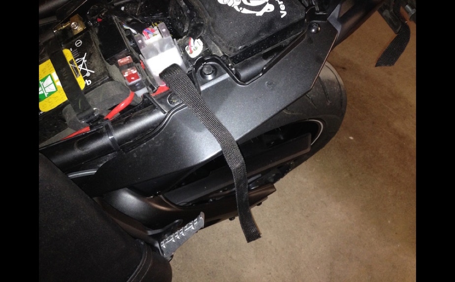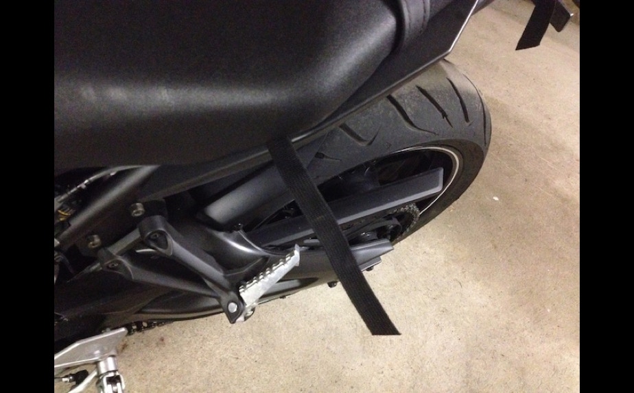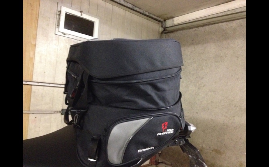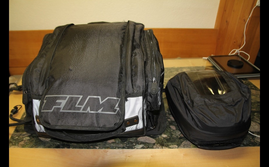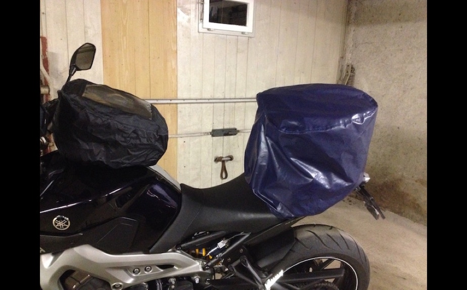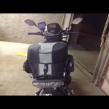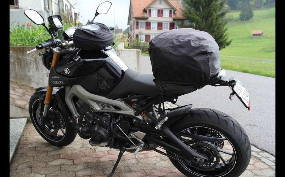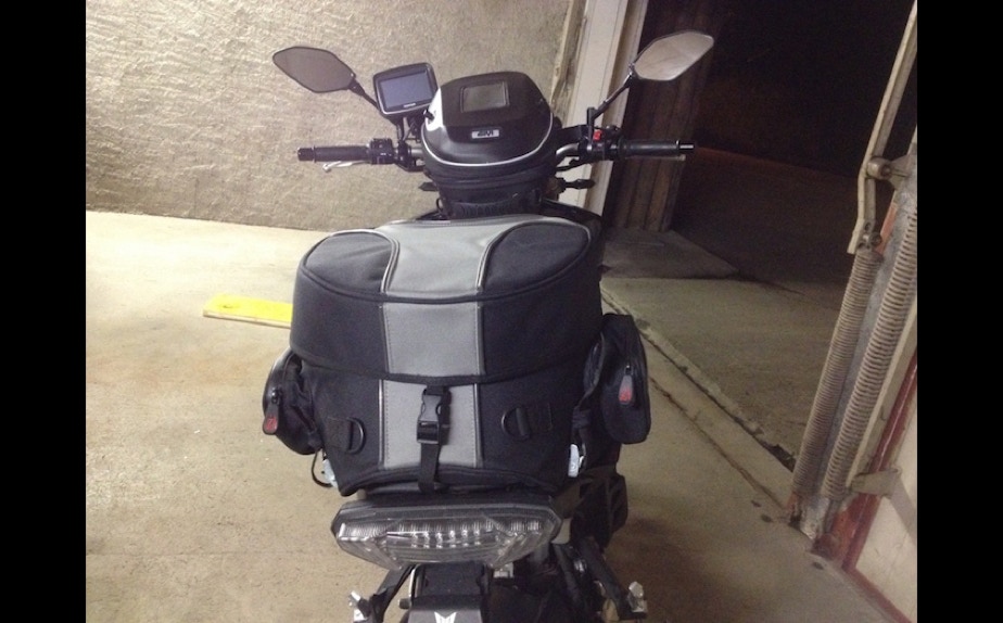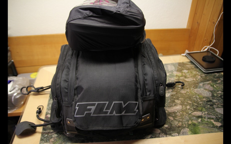 Das Gepäck für eine Woche und eine Person kann man gut auf der Rücksitzbank in einer Satteltasche „Rearbag“ verstauen. Damit die Tasche schnell montiert und demontiert werden kann, bietet sich eine unter dem Sitz montierte Halterung mit Laschen an. Für den ersten FLM Bag hatte ich Rundlaschen montiert für den zweiten sind Riemen gefordert. Somit ist einer schnellen Demontage und Montage nichts mehr im Wege. Die Riemen wurden gelocht und mit einer grossen U-Scheibe an vorhandenen Schrauben angebracht. Was auch wichtig ist auf Reisen ist die Reichweite. Damit das Befüllen des kleinen Tanks wenigsten schneller geht habe ich am oberen Rand des Einfüllstutzens Löcher gemacht, damit die Luft aus dem oberen Teil des Tanks schneller entweicht. Somit gehen knapp 15 Liter Benzin in den Tank was für fast 300 km. Für den kleinen Krimskrams oder eine Tagestour habe ich den kleine GIVI Tankrucksack mit Klicksystem und Handy Sichtfeld.